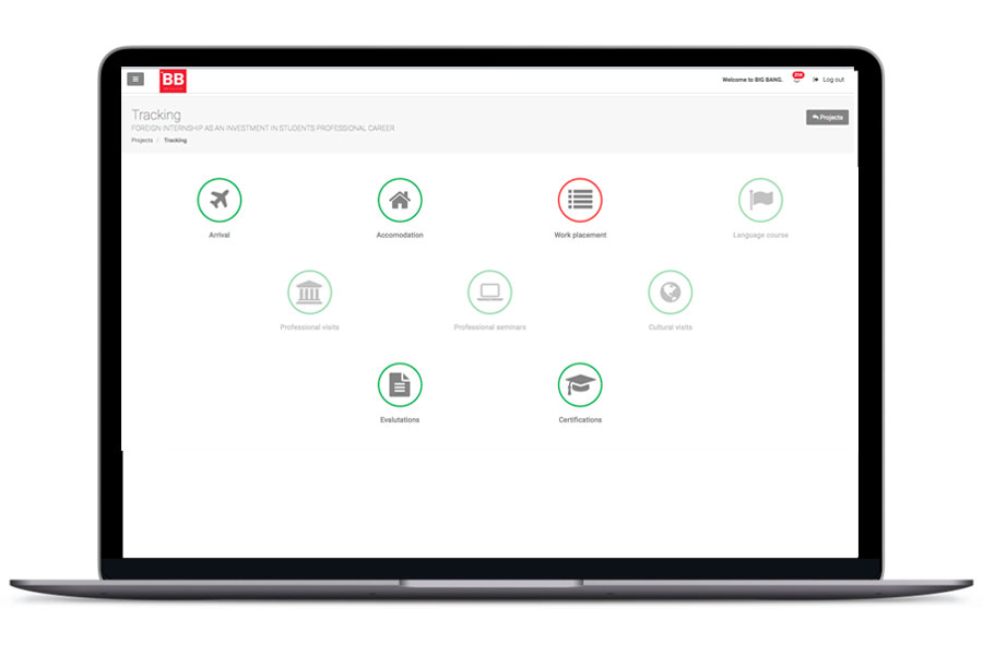 Come chiarito in precedenza, un progetto di mobilità presenta diverse criticità in tutte le sue fasi: prima della mobilità sono centrali gli aspetti legati all’organizzazione della logistica e alla produzione e sistemazione di tutta la documentazione necessaria; in fase di mobilità è fondamentale verificare sia gli aspetti relativi alla sistemazione dei partecipanti, sia quelli più propriamente formativi, legati alle attività svolte e al work placement; di ritorno dalla mobilità è importante raccogliere e organizzare in maniera puntuale tutta la documentazione necessaria per la rendicontazione e il report finale. Big Bang consente di disporre di un unico punto, accessibile online in qualsiasi momento, per reperire le informazioni, monitorare l’andamento delle attività, caricare/scaricare o archiviare la documentazione di supporto.